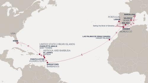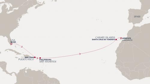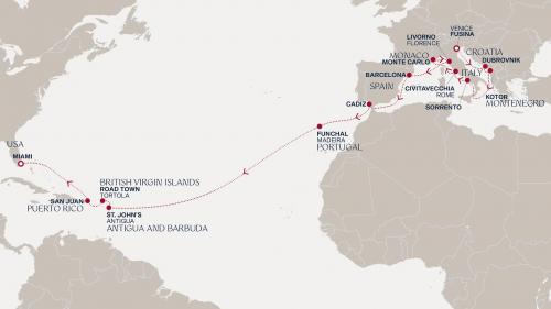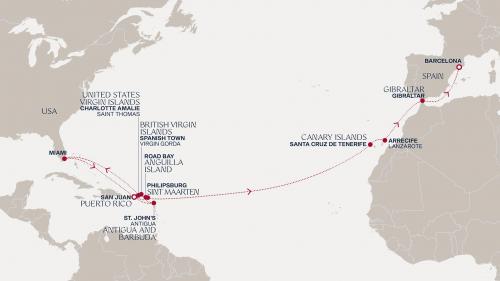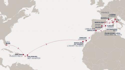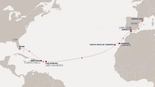 〈主要な寄港地〉 マイアミ / サンファン / フィリップスバーグ / サンタ・クルス・デ・テネリフェ / ランサローテ島 / ジブラルタル海峡 / バルセロナ
