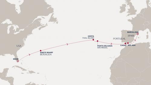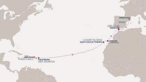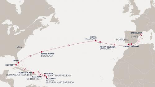 〈主要な寄港地〉 サンファン / プンタレナス / アンバーコーブ / キーウェスト / マイアミ / オルタ / ポンタデルガーダ(アソーレス諸島) / カディス / マラガ / バルセロナ