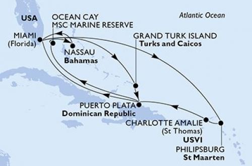 〈主要な寄港地〉 マイアミ / グランドターク / アンバーコーブ / オーシャンケイのMSC海洋保護区 / ナッソー / フィリップスバーグ / シャーロットアマリー/セントトーマス島