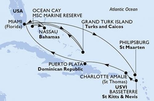 〈主要な寄港地〉 マイアミ / フィリップスバーグ / バセテール / シャーロットアマリー/セントトーマス島 / アンバーコーブ / グランドターク / オーシャンケイのMSC海洋保護区 / ナッソー