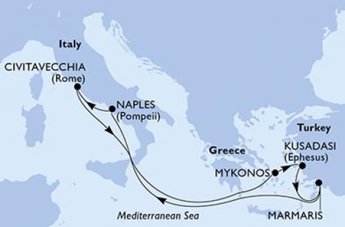 〈主要な寄港地〉 バルセロナ / カンヌ / ラスペツィア / コルシカ島 / バレッタ / メッシーナ(シチリア島) / ナポリ / チビタベッキア/ローマ / カリアリ(サルディニア島) / パルマデマヨルカ