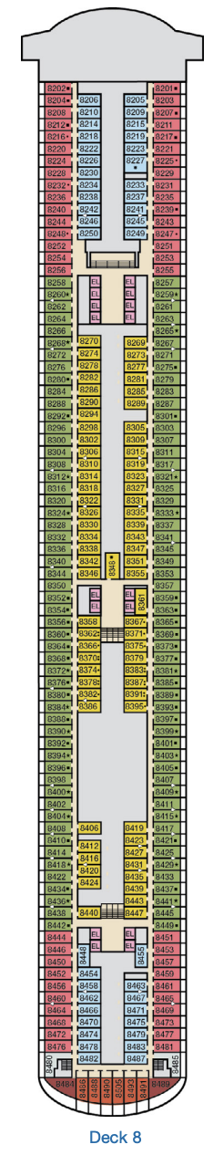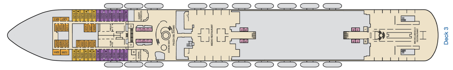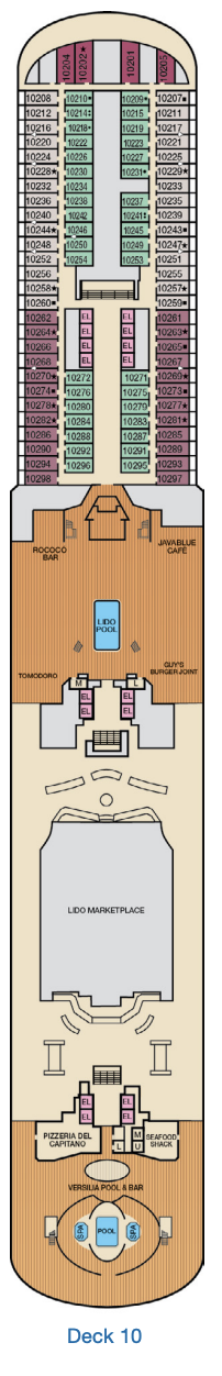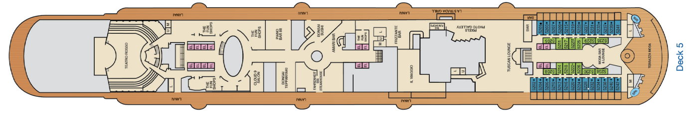 テラッツァ カバナ   - テラッツァ カバナ ステートルームは、船上で最も望ましい住所の 1 つであるデッキ チェアを備えた独自のラウンジ パティオに不動産を提供します。さらに、素晴らしいドリンク、エンターテイメント、ジャグジーなどを終日楽しめる専用プライベートデッキに簡単にアクセスできます。(テラッツァのステートルームのゲストは12歳以上である必要があります。