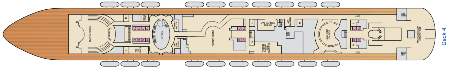 現代のルネッサンスで新しい体験を楽しんで、忘れられない休暇を満喫してください。13軒のレストランと7軒のバーで最高のイタリアを満喫できる美味しい料理、快適で洗練された家具を備えたイタリアン スタイル、海が見える開放的な空間でゆったりとくつろげる、ここはまさに洋上のイタリア!