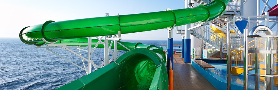 - ご家族で楽しめるスライダー。コースの一部は船外に飛び出し、下には海が見えてスリル満点!