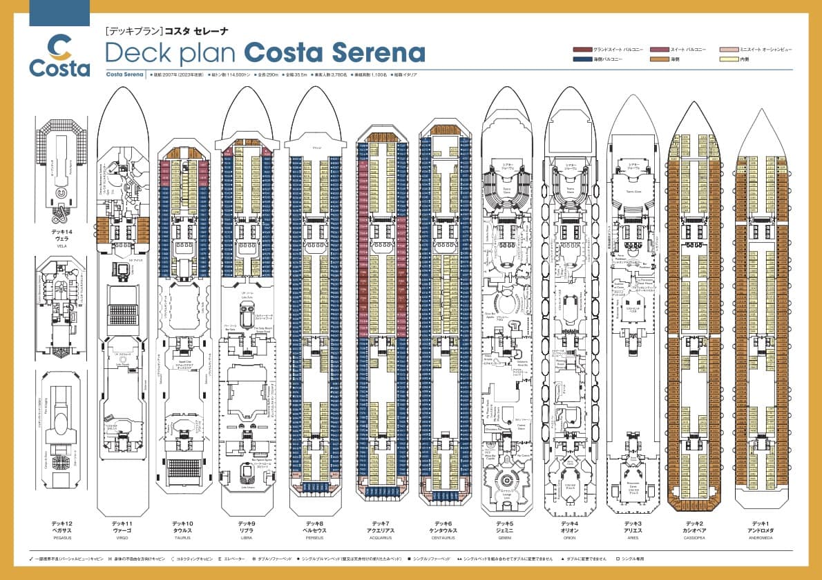 調和と安らぎを意味する「セレーナ」と名づけられたこのコスタセレーナ客船は、姉妹船、コスタパシフィカと同型船となります。2つのデッキを占めるサムサラスパはヘルスケア・リラックスに最適でサムサラスイートからスパへ直接アクセスできます。広々としたパブリックエリアやデッキからの眺めは最高です。日本での就航をスタートする『コスタセレーナ』。日本各地の魅力ある寄港地を巡る航路です。2021年は船も航路もスケールアップした「コスタセレーナ」でご夫婦、ご家族、お友達と気軽に船旅をお楽しみください。