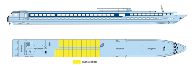 客室は すべて川に面しています。窓も大きく明るい設計となっています。設備:エアコンディショナー、洗面所、シャワー、トイレ、TV、金庫、クローゼット、ヘアドライヤー、シャンプー、救命胴衣が供えられています。電源は 220V(Cタイプ 2つ穴) スリッパ、ガウンはありません。ベッドは ツインとダブルがあります。また スィートルームもあります。