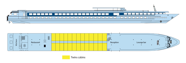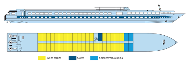 客室は すべて川に面しています。窓も大きく明るい設計となっています。設備:エアコンディショナー、洗面所、シャワー、トイレ、TV、金庫、クローゼット、ヘアドライヤー、シャンプー、救命胴衣が供えられています。電源は 220V(Cタイプ 2つ穴) スリッパ、ガウンはありません。ベッドは ツインとダブルがあります。また スィートルームもあります。