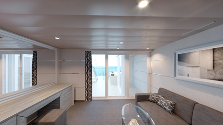 - フロア面積: 広さ約35㎡・プライベートバルコニー約9㎡/ツインベッドに変更な快適なダブルベッド(要リクエスト)/ダブルソファベッド付きリビング/シャワーとヘアドライヤー付きバスルーム/大型ワードローブ/インタラクティブTV/Wi-Fiインターネット接続(有料)/電話/セーフティボックス/ミニバーと空調設備/最大ご利用人数4名