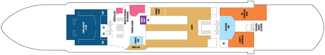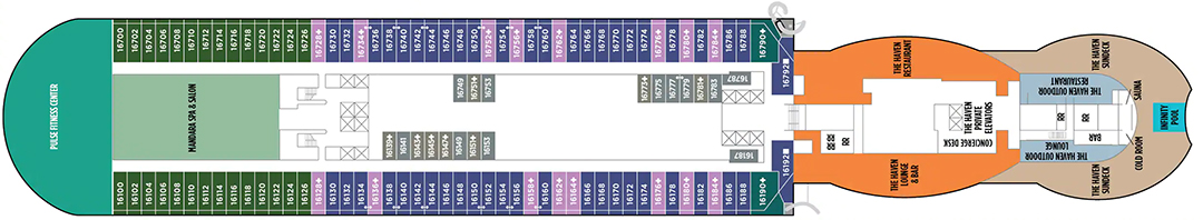 - フロア面積: 77 m2/バルコニーの広さ: 46 m2/船後方と屋外ジャグジーから素晴らしい景色が望める、船尾側の広々としたラージバルコニー付きペントハウスで、洗練されたスタイルと贅沢な時間をお楽しみください。 キングサイズベッド、ジェットシャワー付きの贅沢なバス、ザ・ヘブンのお客様専用アメニティへのアクセスなどに加え、バトラーとコンセルジュのサービスもあり、充実した環境で快適にお過ごしいただけます。