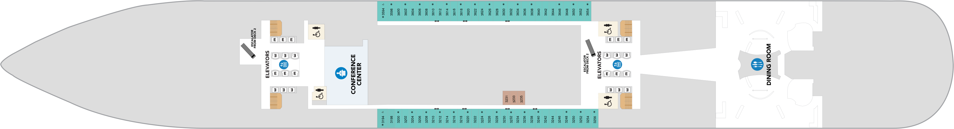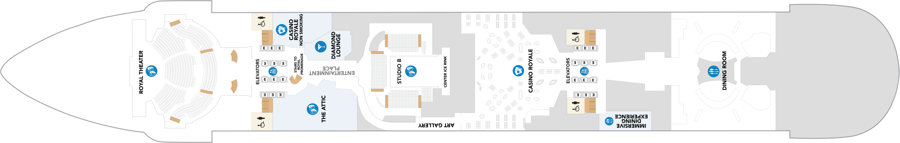- 3デッキ構造でデッキ別に雰囲気の異なる装飾。優雅な空間を演出しながらのお食事をどうぞ。フルコースのお料理からスイーツまでご提供する優雅なメインダイニングレストラン。