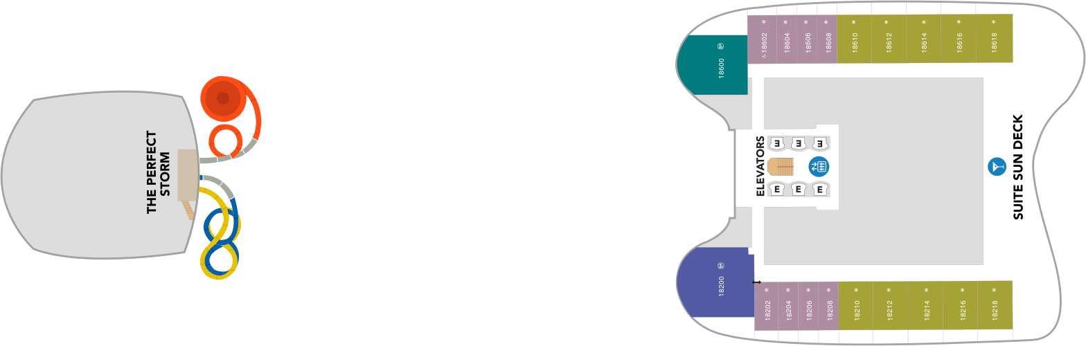 - 果敢にスリルに挑戦。入り口の暗闇に吸い込まれると、もう引き返すことはできません。10デッキ分(約30m)の高さから急降下する最驚のスライダーを体験してください。