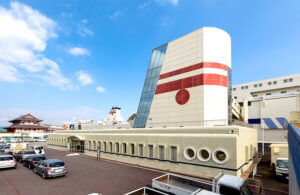発着場所は名門大洋フェリー 新門司ターミナル。2015年に新たに誕生したフェリーターミナルには、多目的トイレやスロープが備えられ車椅子のままフェリーへ乗船できるなど、細かい配慮がなされています。また、タイムズカープラスのカーシェアもあり、とても便利。「名門大洋フェリー」の看板が出ています。