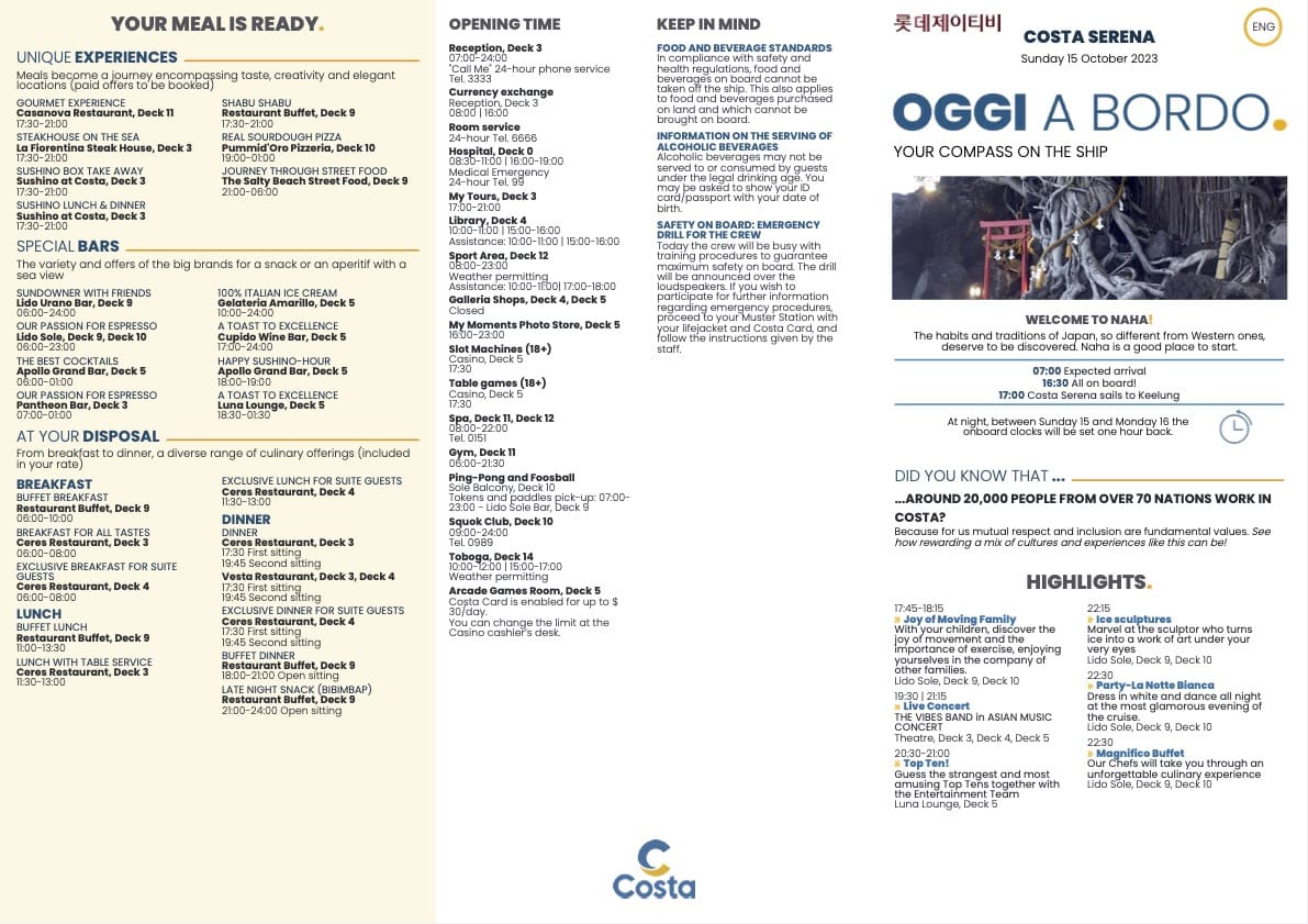 2026年10月7日出航 コスタセレーナ横浜乗船 日本一周クルーズ11泊12日(日本語の船内新聞とメニューのご用意の予定あります)